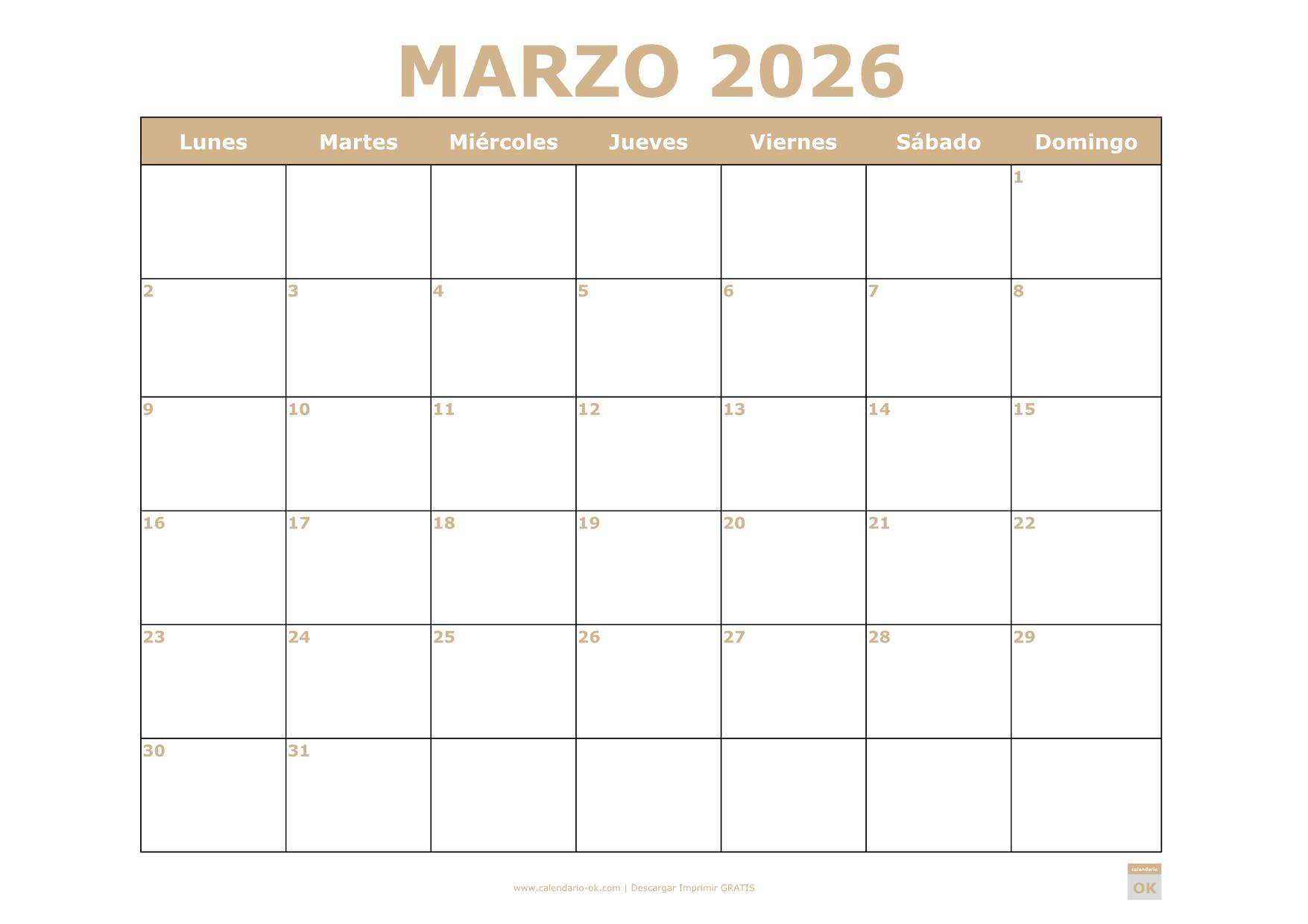 IMPRIMIR CALENDARIO MARZO 2026 EXCEL BEIGE