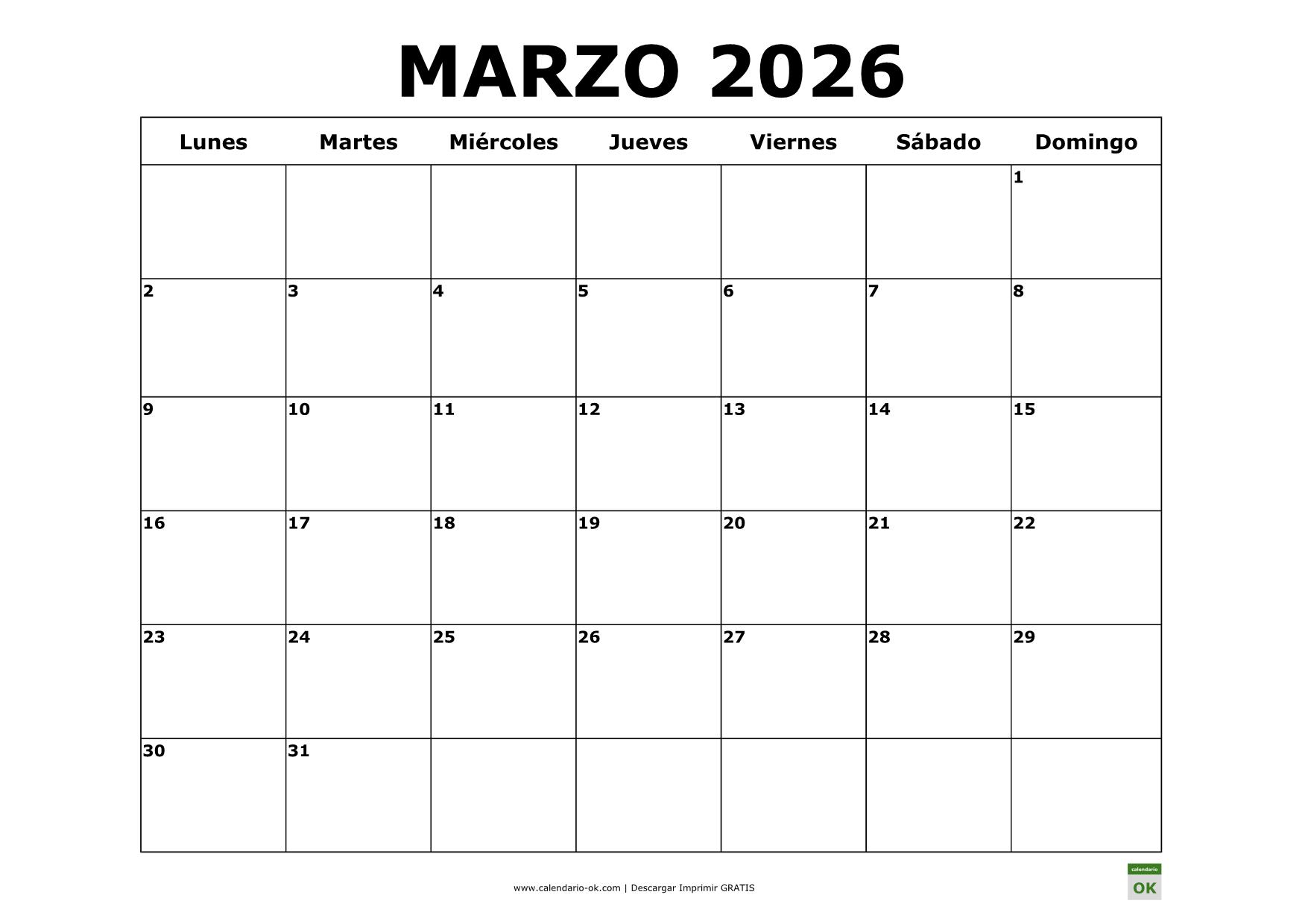 Nuestro calendario mes marzo 2026 para imprimir es muy fácil de usar y tiene un diseño elegante. La plantilla del calendario mensual 2026 marzo tiene un gran significado para la organización y planning marzo 2026 calendario de tus tareas, reuniones y actividades. Podrás distribuir fácilmente tus tareas por días y semanas. Nuestros calendario mes marzo 2026 imprimibles te ayudan a tener en cuenta y no olvidar fechas importantes y eventos.