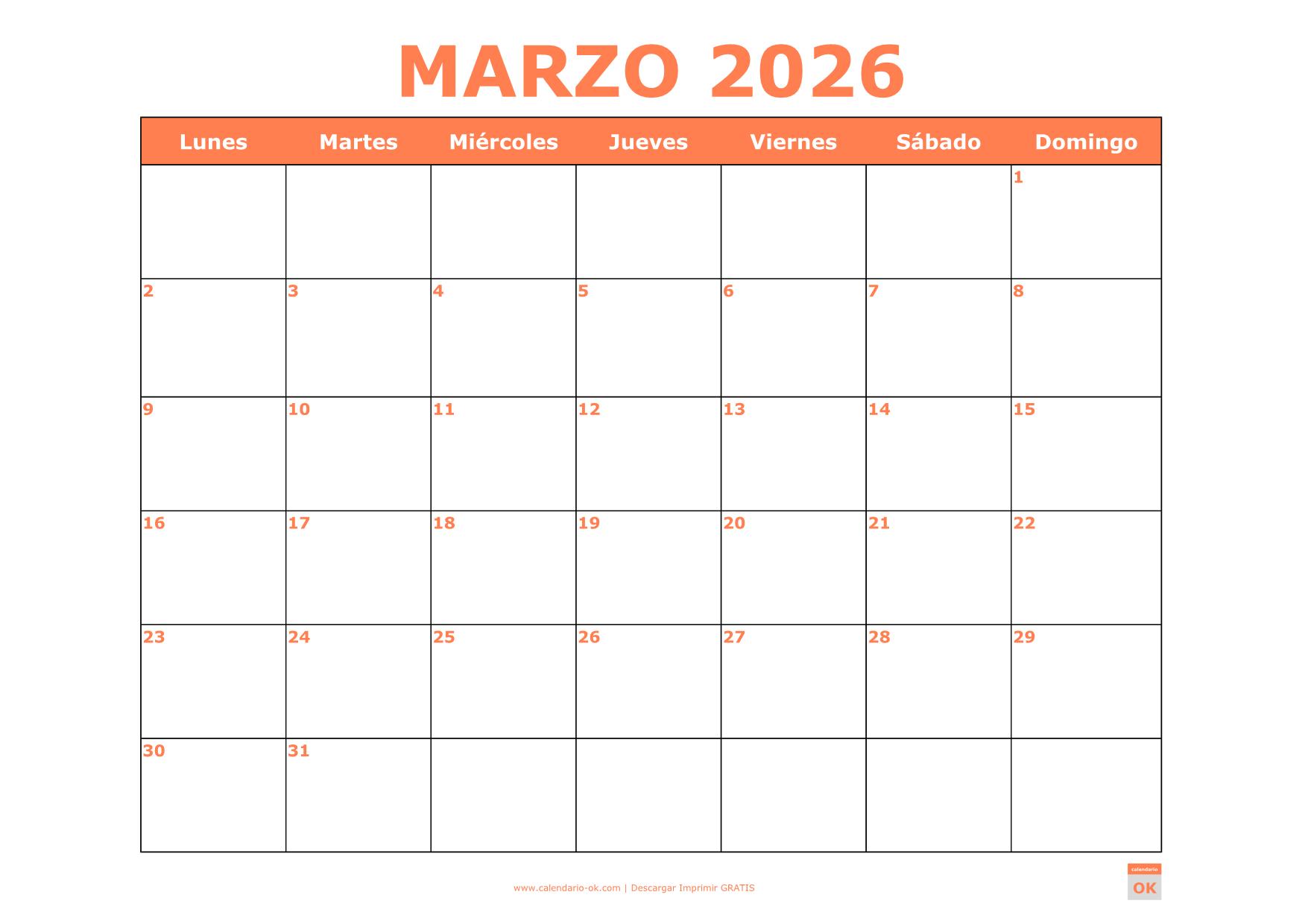 CALENDARIO MARZO 2026 PDF PARA IMPRIMIR NARANJA