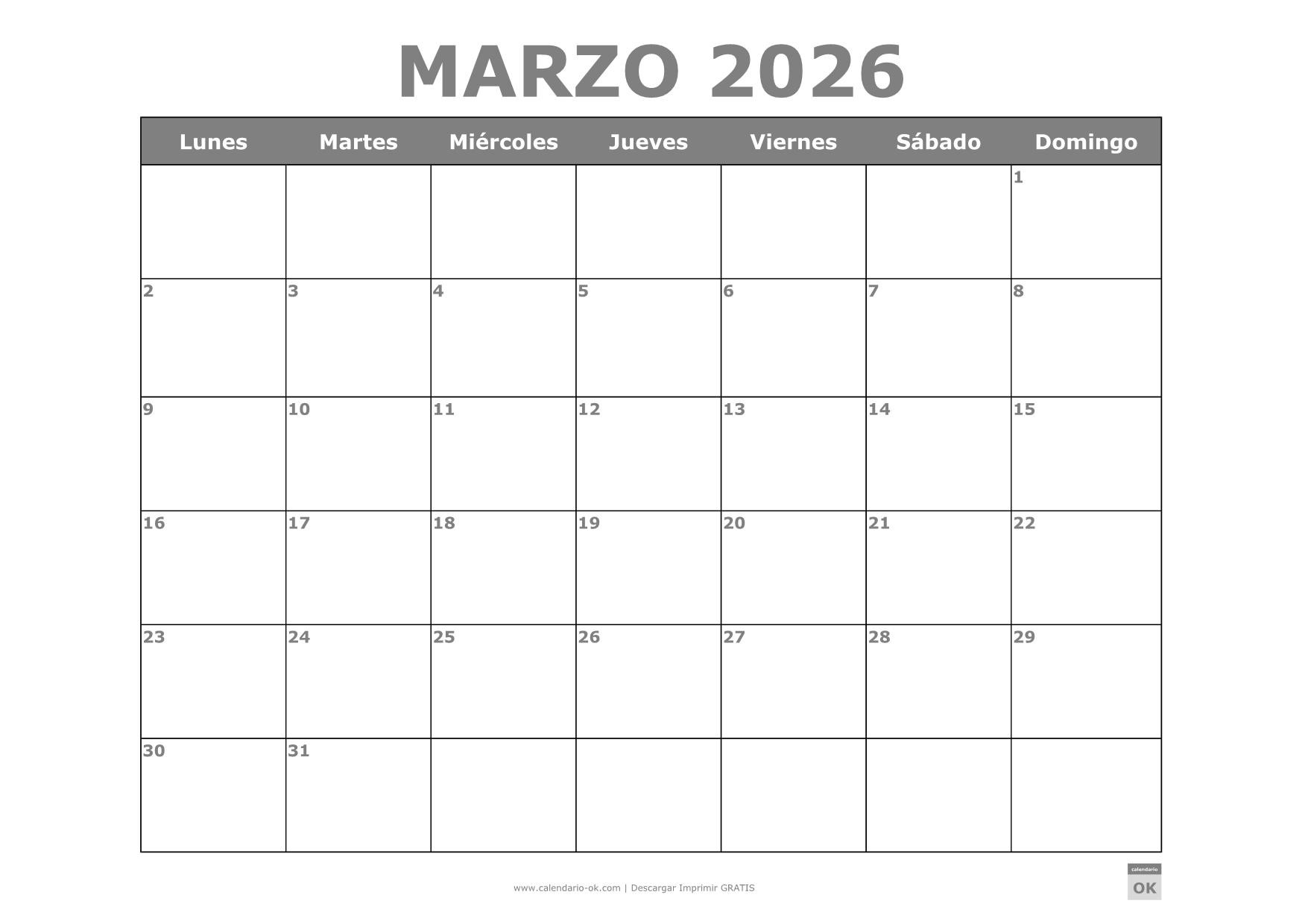 CALENDARIO MARZO 2026 PDF PARA IMPRIMIR GRIS