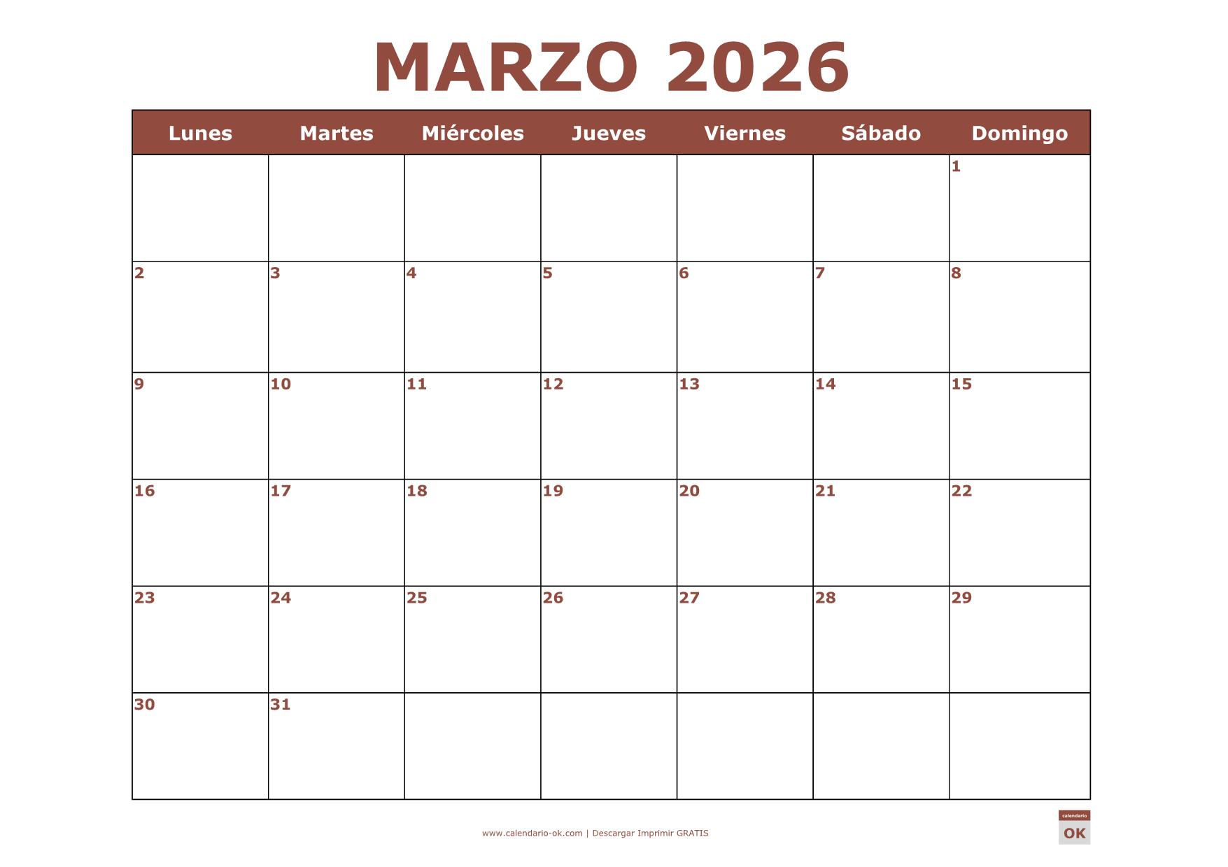CALENDARIO MARZO 2026 PDF MARRÓN