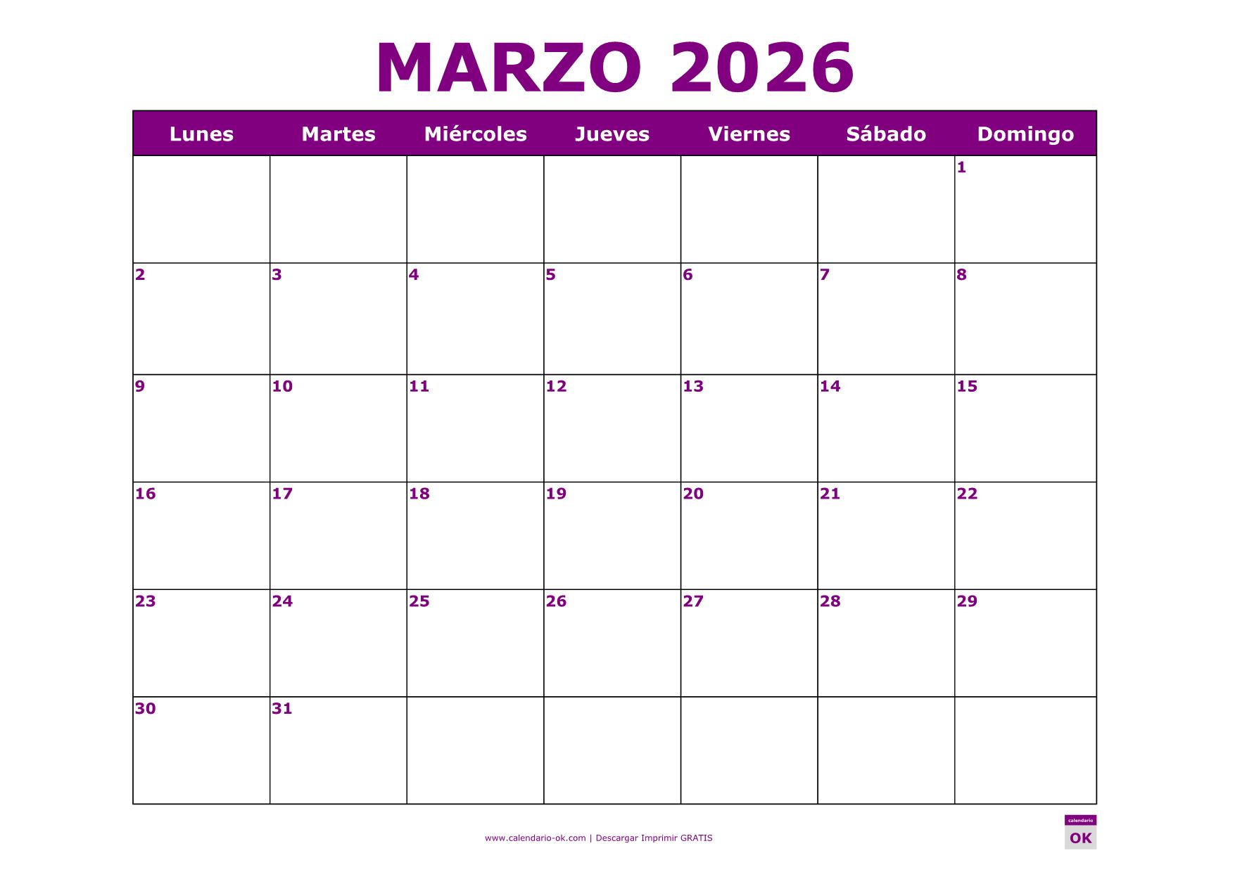 CALENDARIO MARZO 2026 PDF PARA IMPRIMIR PÚRPURA