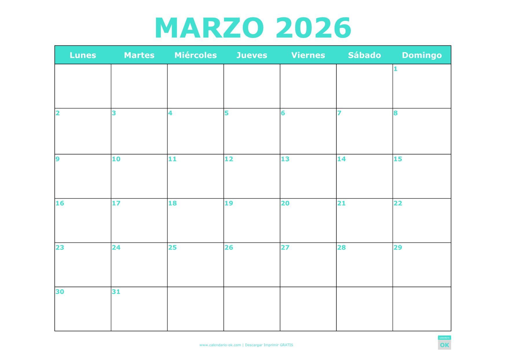 DESCARGAR CALENDARIO MARZO 2026 PDF TURQUESA